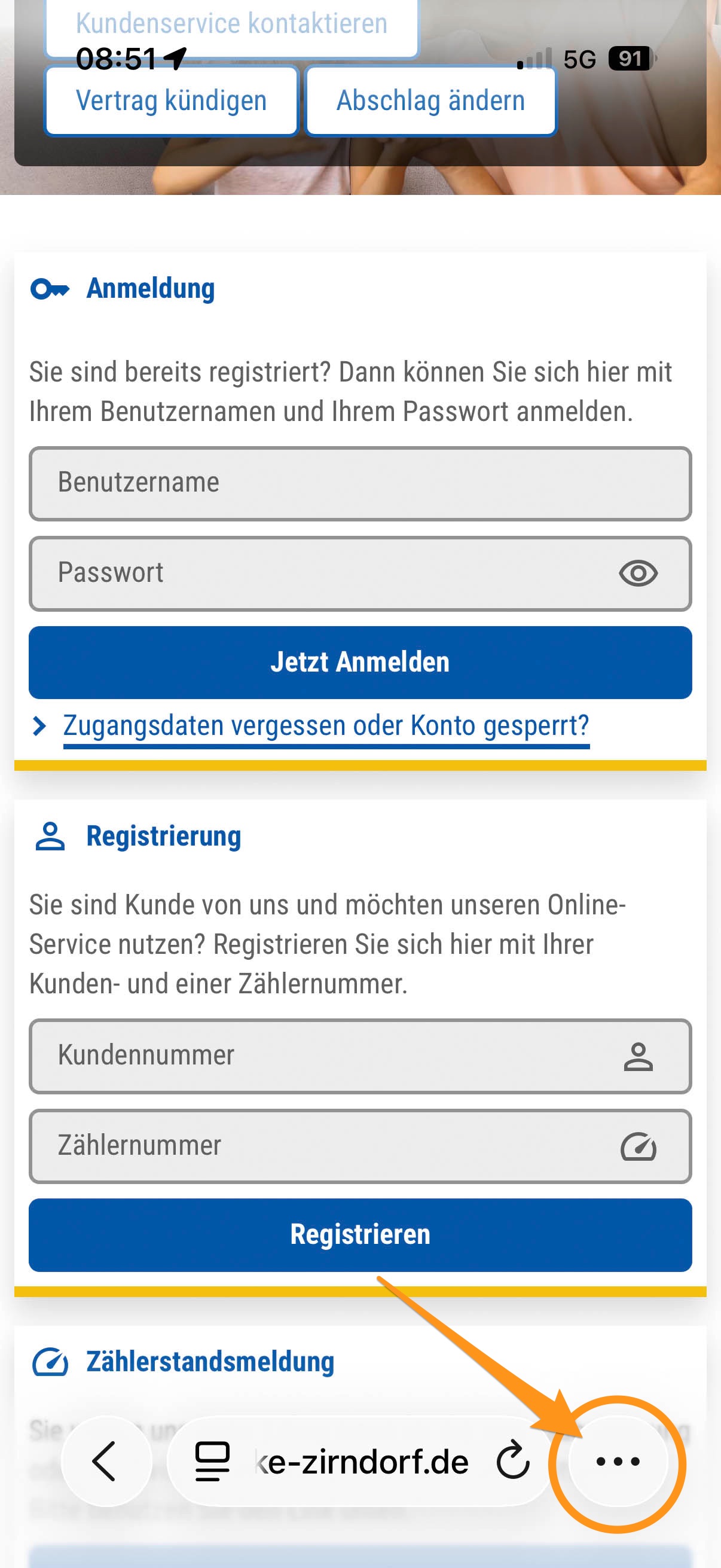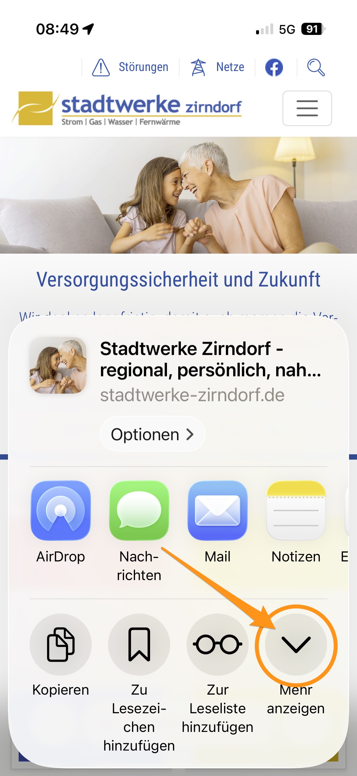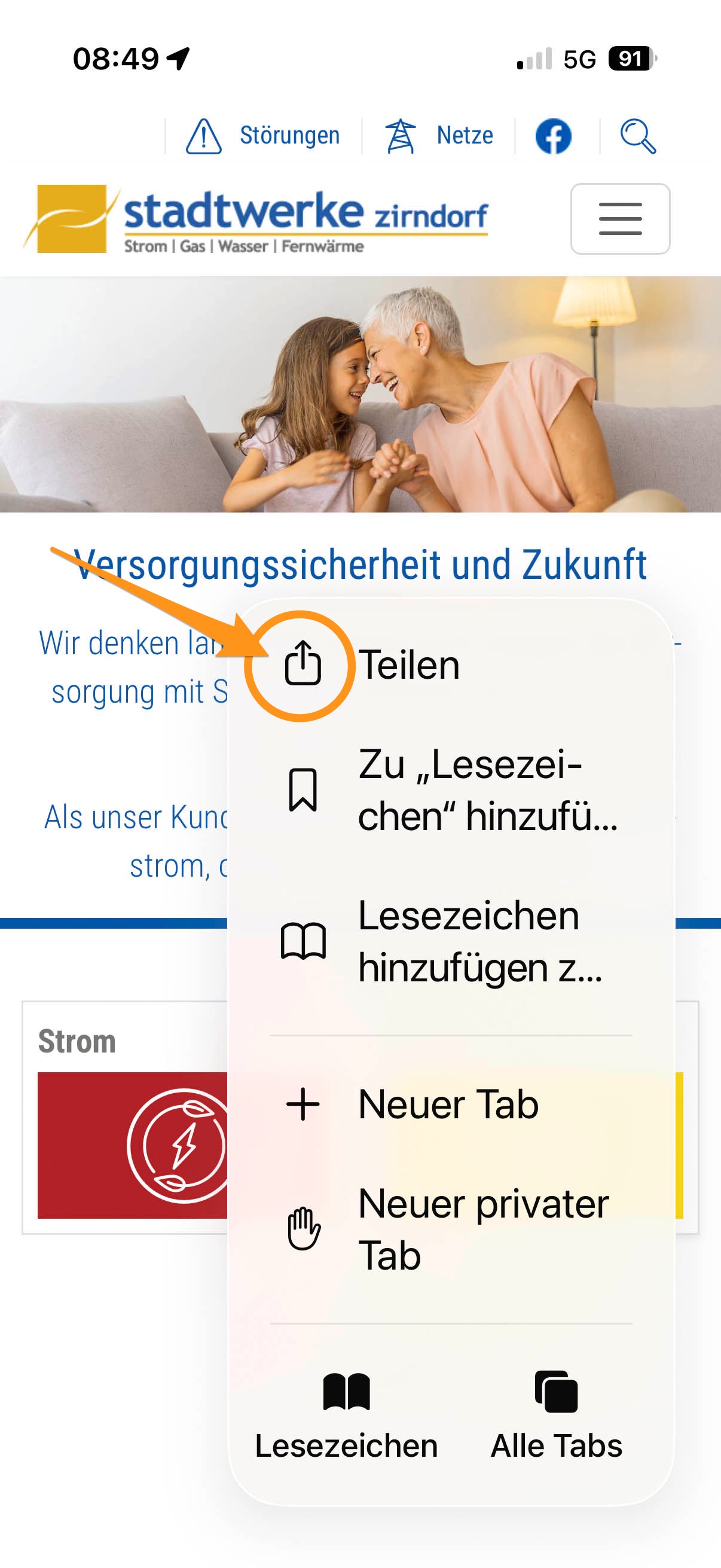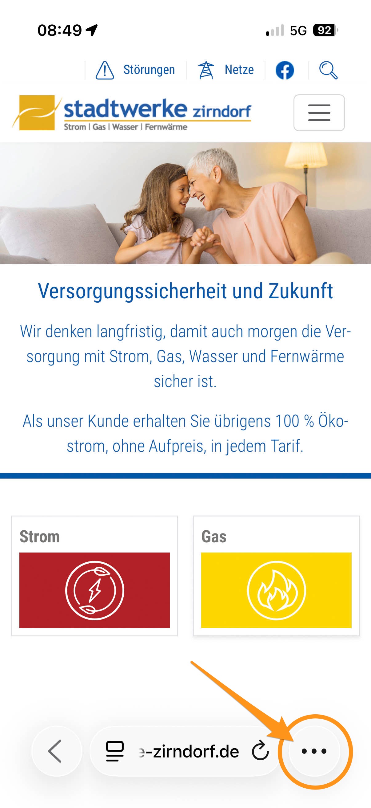 Öffnen Sie Safari und geben unsere Webadresse www.stadtwerke-zirndorf.de ein. Klicken Sie dann unten rechts auf die 3 Punkte.
