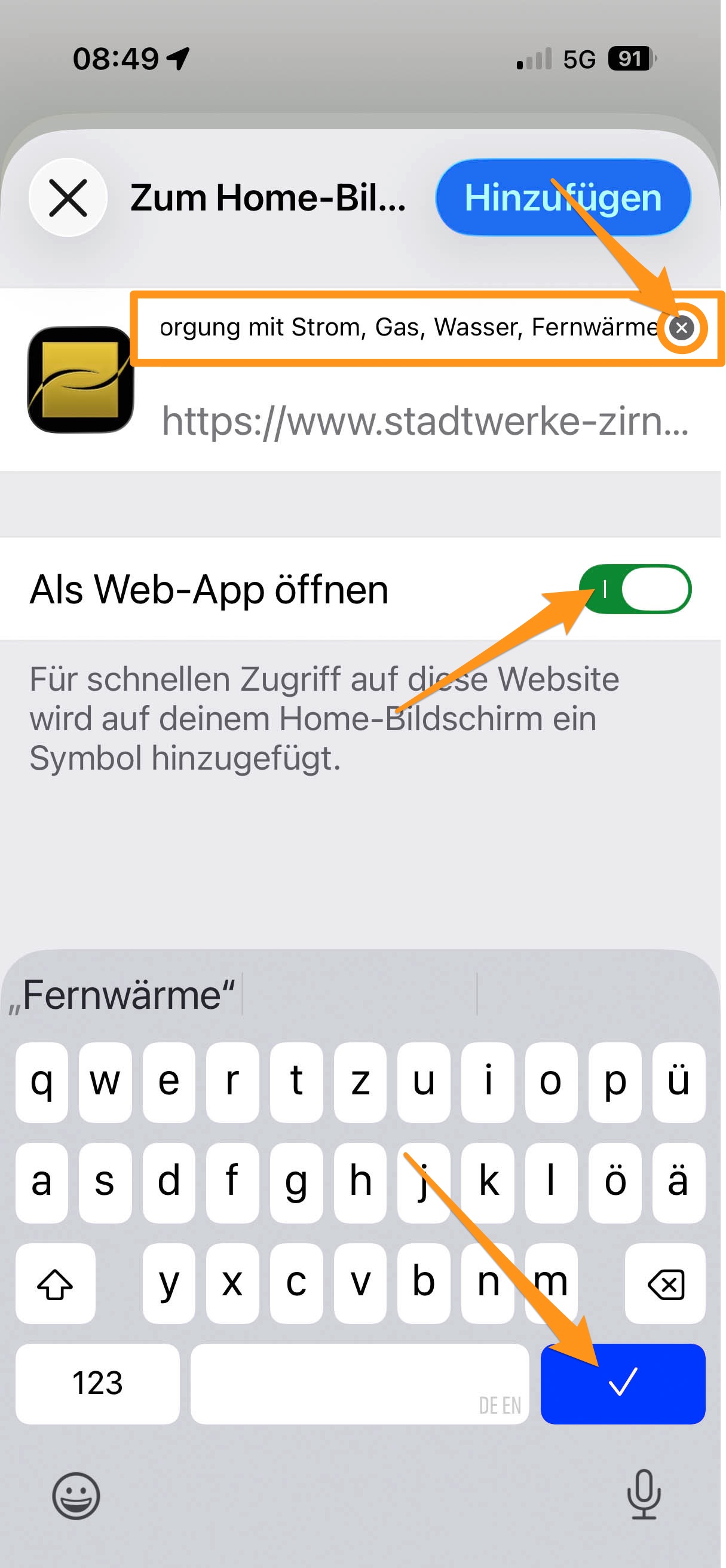 Geben Sie als erstes oben einen gewünschten Namen für Ihr Lesezeichen (app) ein.